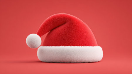 A soft red Christmas hat with a fluffy white trim, resting on a solid red background. Perfect for evoking holiday cheer and festive spirit.