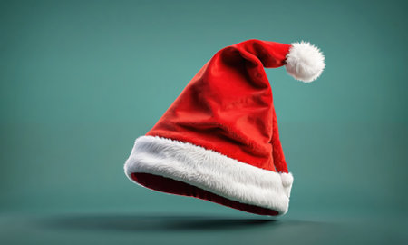 A red Santa hat with a white trim and pom-pom is floating against a teal background
