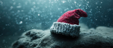 A delightful red Christmas hat hovers gracefully in a snowy ambiance, evoking feelings of warmth and joy. Perfect for winter celebrations and festive decorations.
