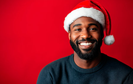 Portrait of happy black man wearing christmas santa hat over blue background.