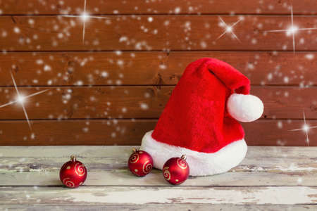 Fluffy Santa hat with red christmas balls on aged wooden table near wooden wall. View with copy space.