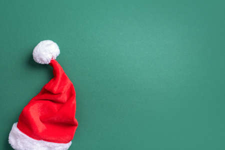 Red Santa Claus hat on green background. Top view. Copy space. Advent time. New year composition. Decoration for winter holidays celebration. Christmas greeting card