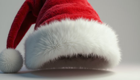 A classic red Santa hat, adorned with a plush white fur trim and a fluffy pom-pom, rests elegantly against a soft, neutral background. This iconic holiday accessory evokes feelings of joy and celebration, perfect for the festive season.