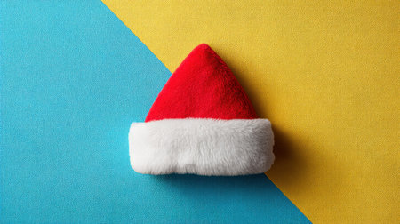 Bright red and white Santa hat on a colorful blue and yellow background, symbolizing the joyous festive spirit and vibrant holiday celebrations of winter.