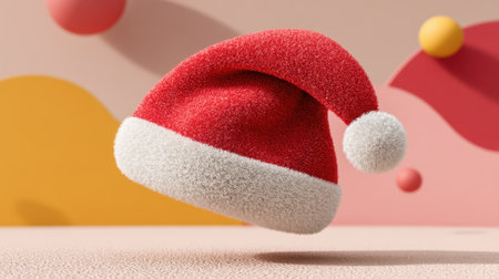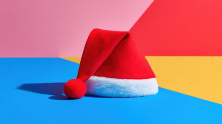 This playful image features a vibrant Santa hat resting on a colorful geometric background. Perfect for holiday festivities, it adds a touch of festive cheer to any design.