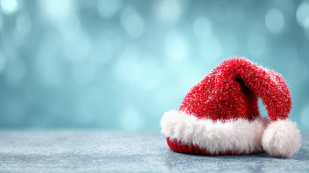 A charming red Santa hat with white fur trim rests on a sparkling blue background, evoking holiday cheer and warmth for festive celebrations and winter events.