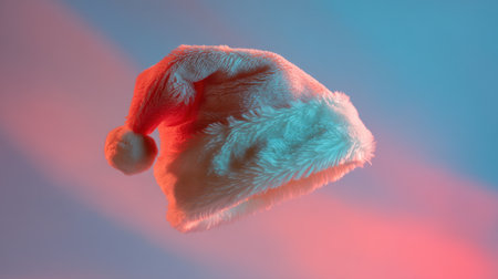 This image features a fluffy Santa hat floating gracefully against a vibrant blue and pink background, perfectly capturing the spirit of festive celebrations and cozy winter vibes.