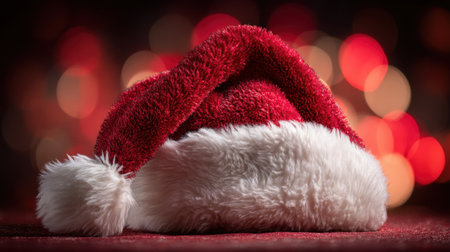 A plush red Santa hat with a white fur trim rests against a vibrant bokeh background, evoking warmth and joyful celebration for the holiday season.
