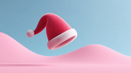 This image features a floating red Santa hat on a soft pink background, creating a whimsical and cheerful vibe perfect for holiday-themed designs and marketing.