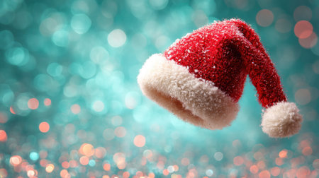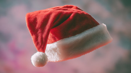 A classic red Santa hat with soft white fur trim floats serenely against a blurred colorful background, evoking festive cheer and holiday spirit perfect for seasonal visuals.