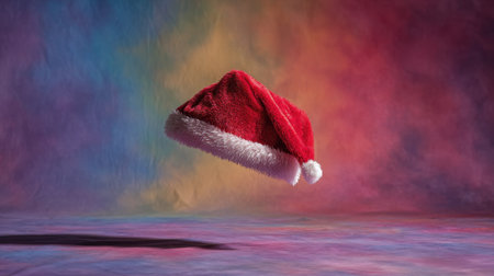 A bright red Santa hat floats gracefully in mid-air, contrasting with a vibrant, colorful background, capturing the essence of holiday joy and celebration.
