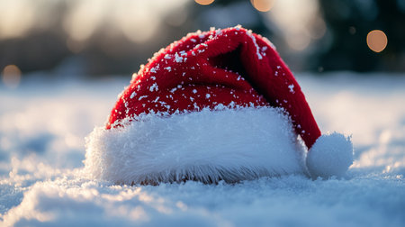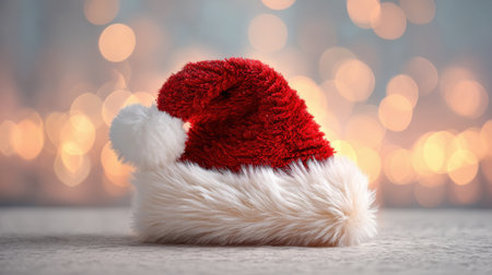 A charming red and white Santa hat with a fluffy trim is showcased against a backdrop of soft, glowing holiday lights, embodying the joy of the festive season.