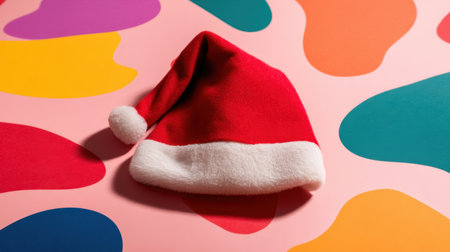 A vibrant red and white Santa hat rests on a colorful abstract background, perfect for festive themes, holiday celebrations, and joyful moments during the winter season.