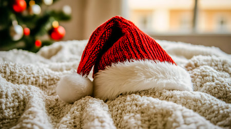 A charming Santa hat adorned with faux fur sits on a soft surface, illuminated by warm ambient light, capturing the spirit of the festive holiday season.