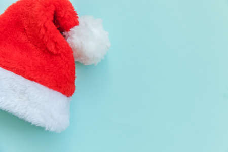 Simply minimal design Christmas Santa Claus hat isolated on blue pastel colorful trendy background. Christmas New Year december time for celebration concept. Flat lay top view copy space