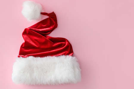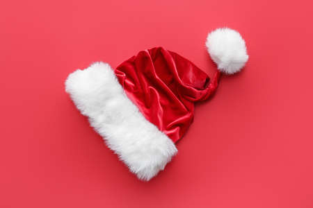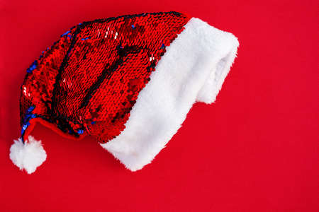 Santa hat decorated with sequins on red background. Top view, copy space. Xmas concept