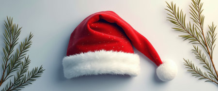 A classic red Santa hat, complete with a fluffy white brim and pom-pom, rests elegantly against a soft, light background. The surrounding evergreen branches add a touch of nature, evoking the warmth and joy of the holiday season.