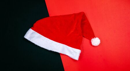 Greeting Season concept.Santa Claus hat with christmas light on red and green background