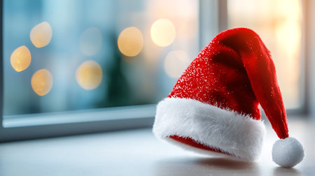 Santa Claus hat on window sill with bokeh background. Merry Christmas and Happy New Year