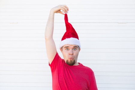 Holidays, christmas and people concept - funny handsome man in santa hat have fun on white background with copy space