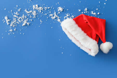 Minimalistic concept of Christmas. Red Santa Claus hat on a blue background. Xmas or Noel background. flat lay, top view.