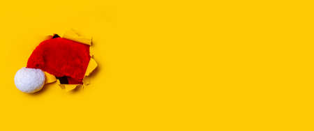 Santa Claus hat in a hole in a torn yellow background. Banner.