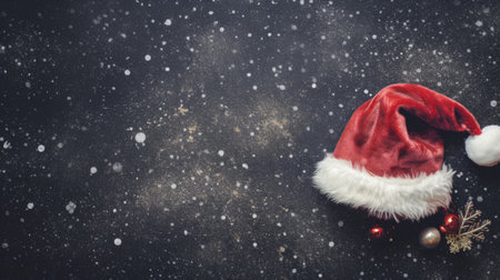 A vibrant red Santa hat with a fluffy white brim and pom-pom sits atop a dark surface, surrounded by festive decorations. The scene is adorned with pine branches, colorful ornaments, and delicate snowflakes, evoking a joyful holiday spirit.