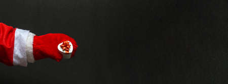 Close-up of Santa Claus in red mittens holding a gift on a black background with copy space. Banner