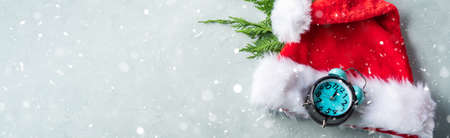 Christmas and New Year composition with clock in Santa hat showing the eve of the holiday. Top view, close up on light blue background.
