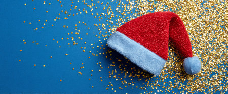 A bright red santa hat lies on a vivid blue surface with golden glitter sprinkled around. This scene captures the joy and excitement of holiday celebrations and decorations.