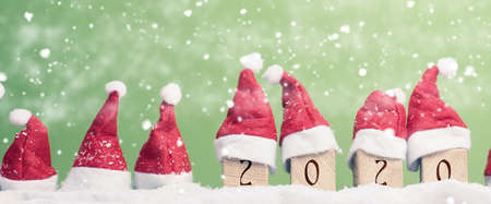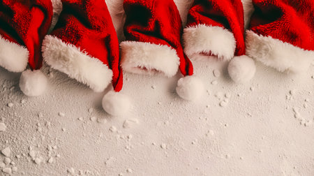 Many hats of Santa in a row with snow, Christmas background, panoramic view
