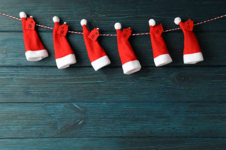 Three red Christmas hats hang from a rope against a blurred shiny blue-gray background. Copy space. Concept