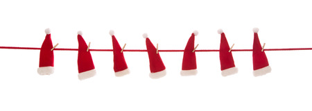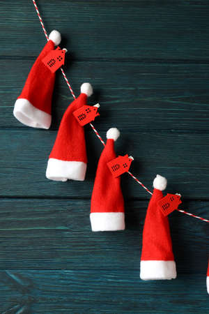 Merry Christmas and Happy New Year with many hats of Santa in a row on a rustic wooden table, seasonal or holidays concept