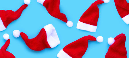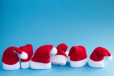 New Year's patern, little hats of Santa Claus rhythmically lie diagonally on a blue background. Copy space, flat lay