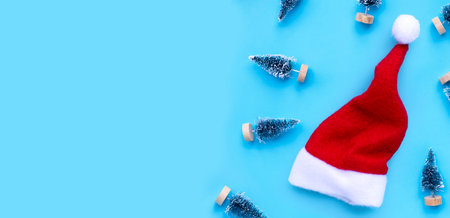 Creative Santa Claus hat pattern over blue background. Minimal winter flat lay Christmas concept, panoramic image