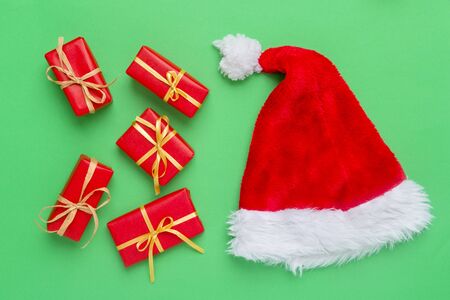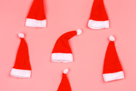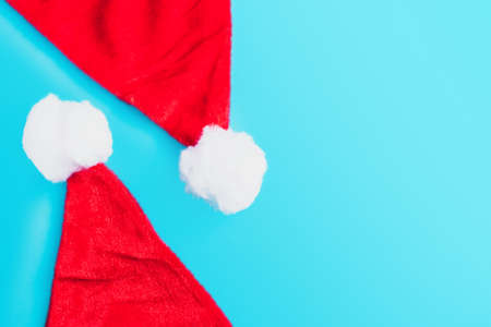 Top view of red Santa hats on colorful background. Merry Christmas concept with copy space.