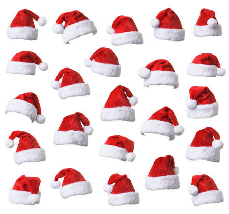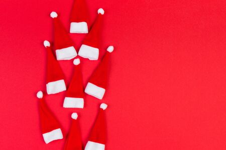 Red Santa Claus hats as a background. Top view. Christmas concept.