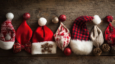 A colorful display of various holiday hats and ornaments arranged on a wooden surface capturing the spirit of New Year celebrations with warmth.
