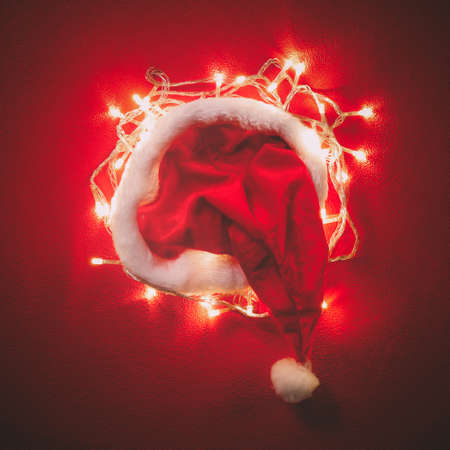 Greeting Season concept.Santa Claus hat with christmas light on red and green background
