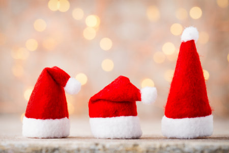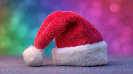 A plush red Santa hat with a white fur trim rests against a vibrant bokeh background, evoking warmth and joyful celebration for the holiday season.