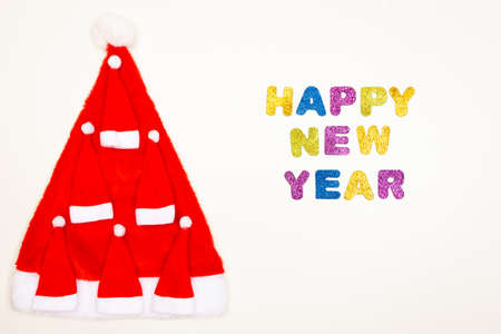 The inscription Happy New Year on a white background, New Year tree from New Years caps