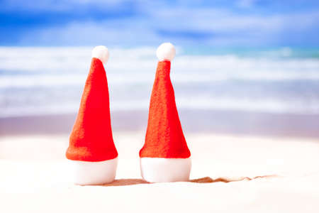 New year on the beach. Two Christmas hats on the beach against the backdrop of the ocean, copy space