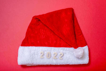 Santa's hat and the numbers of 2022 on a red background. The concept of the new year.