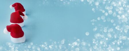 Christmas and New Year holiday background. Santa hats on a blue background and Christmas lights. Place for text.