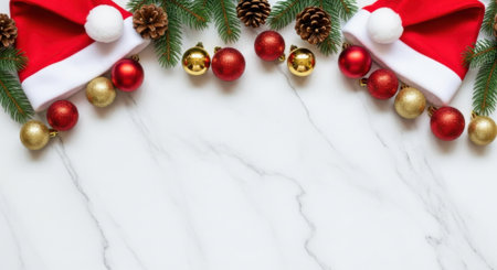 Festive Christmas background with fir branches, pinecones, red and gold baubles, and Santa hats arranged as a top border on a white marble surface with copy space.