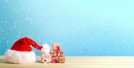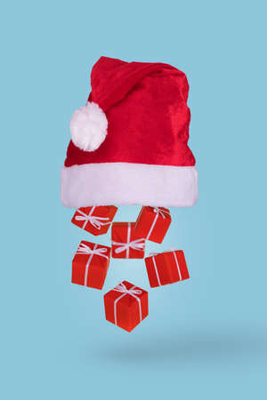 Creative Christmas idea with Santa hat and red gift boxes falling on blue background. Happy holidays. New year minimal concept. Christmas minimal layout.