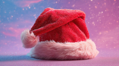 A vibrant Christmas hat featuring a soft, fluffy white trim rests on a colorful background, symbolizing festive spirit and joy during holiday seasons. Perfect for cheerful themes!