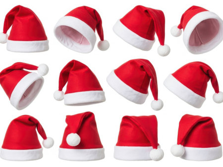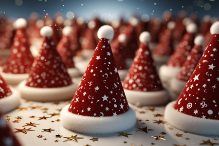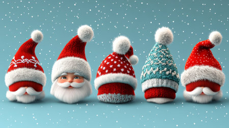 A collection of soft, red Santa hats on a vibrant blue background, perfect for conveying festive spirit and celebrating the joy of the holiday season. Ideal for various holiday projects.