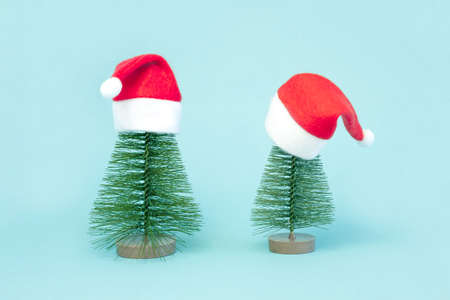 Two small Christmas trees in a red Santa Hats. Decorating of Artificial Fir tree. Beautiful imitation of a mini Christmas tree, with Santa Cap on blue background. Christmas holidays concept