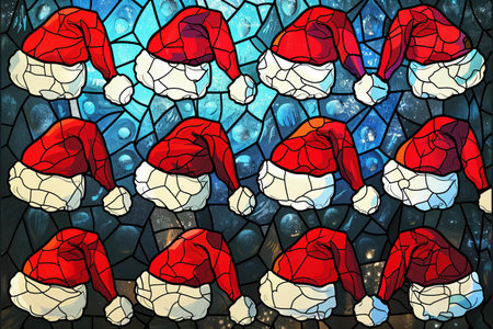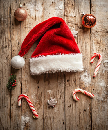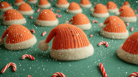 Brightly colored Santa hats and peppermint sticks create a cheerful holiday atmosphere.